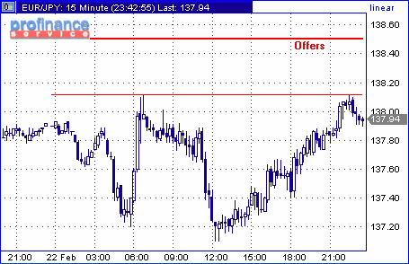 Недавняя попытка закрепиться выше фигуры 138.00 в кроссе евро/йена, кажется, вновь терпит неудачу. За сегодняшний день курс пары уже второй раз тестирует максимумы на 138.12. Первая попытка была предпринята во второй половине азиатской сессии, следующая - во второй половине торгов в Нью-Йорке. Дилеры отмечают, что сейчас рост в паре сдерживают офера двух крупных банков - швейцарского и одного из американских инвестиционных домов. Тем не менее, не смотря на то, что курс пары отброшен ниже фигуры 138.00, эти предложения на продажу в большей степени уже абсорбированы. Далее продавцов удастся найти лишь в районе 138.20.
