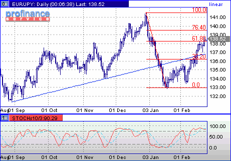 Кросс курс евро/йена, не смотря на давление со стороны закрытия лонгов по йене в начале торгового дня, оставался довольно стабильным на протяжении американской сессии в среду. "Закрытие выше уровня восстановления Фибоначчи 61.8% предполагает повторное тестирование декабрьских максимумов в районе 141.60", - отмечают технические аналитики Merrill Lynch и добавляют, что "все еще многое говорит не трендовой среде текущей торговли. Перекупленность стохастика не дневных графиках говорит о том, что до конца месяца единой валюте будет крайне трудно продолжить наращивание достижений". "В интрадей-перспективе необходимо зафиксировать текущие лонги и ждать вне рынка вплоть до коррекции к уровню 137.50. У этой отметки можно вернуться в длинные позиции", - резюмируют эксперты Merrill Lynch.