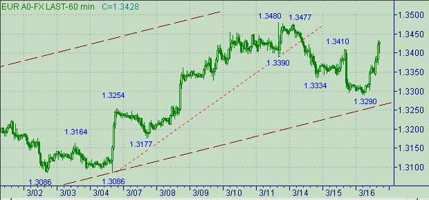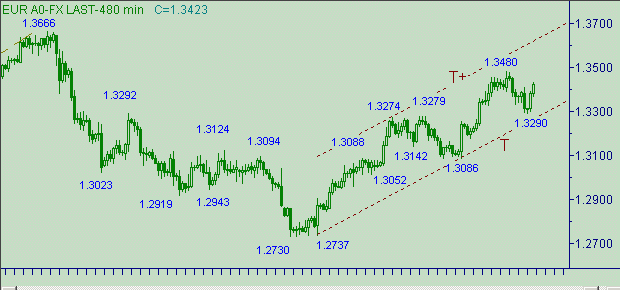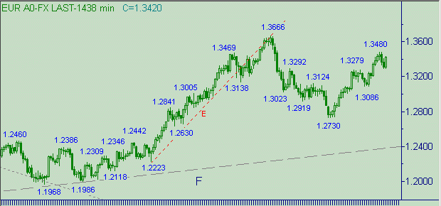 Евро/доллар взлетели ракетой вверх по графику. На повестке дня стандартный вопрос - это продолжение коррекции или уже up-тренд? Структура коррекционной формации с началом от 1.3480(11/03/05): первая ветка - 1.3480(11/03/05 16:38мск.)-1.3390(11/03/05 16:59мск.) длина 90п.; вторая ветка - 1.3477(112/03/05 19:13мск.)-1.3290(16/03/05) длина 187п. Для коррекции от восходящего движения 1.3086(4/03/05)-1.3480(11/03/05) более чем достаточно.