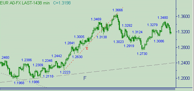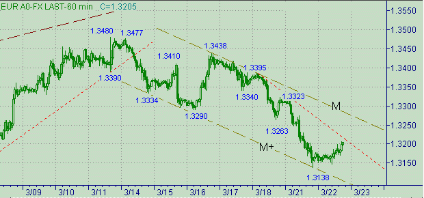 Нисходящее движение с началом от 1.3477(14/03/05) обозначено на рис. 3 каналом M-M+. Структура движения в этом канале: первая down-ветка - 1.3477(14/03/05)-1.3290(16/03/05) длина 187п.; вторая ветка - 1.3438(16/03/05)-1.3138(21/03/05) длина 300п. Важные уровни для коррекционного движения от снижения курса в канале M-M+: 1.3250, 1.3290. Область 1.3290-1.3300 актуальна как для локальной коррекции так и для более весомых движений по паре евро/доллар. Например, закрытие дня выше 1.3300 будет рассматриваться как сильный "Бычий" сигнал.