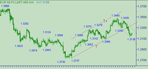 Очень хочется продать от области 1.3250, но мешают вспомогательные индикативные функции, на которых обозначились предпосылки для нового up-тренда. Этого нового up-тренда может и не будет в природе, но предпосылки уже есть и никуда от них не деться. Что делать.. что делать? Два возможных варианта. Первый вариант - продавать от 1.3250 с переносом стоп-лосса на уровень открытия позиции в случае снижения курса до 1.3221. При открытии позиции стоп-лосс определять не ниже 1.3300, цель - 1.3080. Великоват стоп-лосс? "Тогда мы идем к Вам" - есть второй вариант: открывать позиции на продажу от уровня 1.3285, стоп-лосс - 1.3311, цель 1.3140.