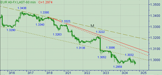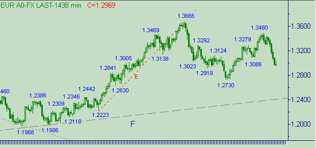 При подходе к области 1.2900 рассматриваем возможности открытия позиций на покупку. Решение вопроса открытие или не открытие покупок будет зависеть от структуры нисходящего движения с началом от 1.3007(24/03/04 16:45 мск.). Если структура нисходящего движения будет иметь законченный вид - позиция открывается. В противном случае - покупка пропускается. Минус рассмотренной тактики - субъективность понятия "законченного движения".