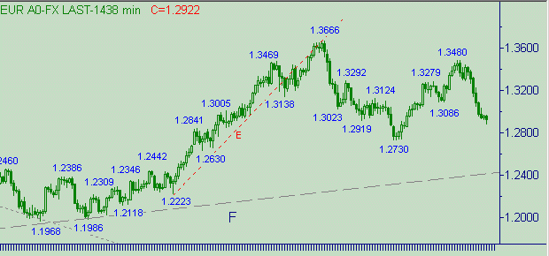 Евро/доллар дают очередной урок по ориентированию - в нисходящем движении с началом от 1.3438(16/03/05) очень и очень сложно определиться с раскладкой самого движения. Вариантов и направлений для творчества много. Поэтому придется