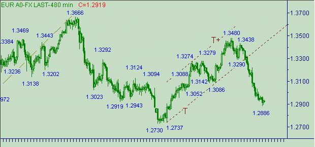 всё делать просто, что бы евро/доллар потянулись в нашу сторону, т.е. в направление открываемых позиций. А если смотреть на графики по-простому, то возможные области окончания нисходящего движения, а следовательно начала как минимум коррекционной формации: 1.2880-1.2900, 1.2765-1.2780, 1.2545-1.2560. Сюда же можно добавить и уровень 1.2730, но уже в качестве не целевого уровня для нисходящего движения, а важного технического уровня.