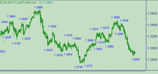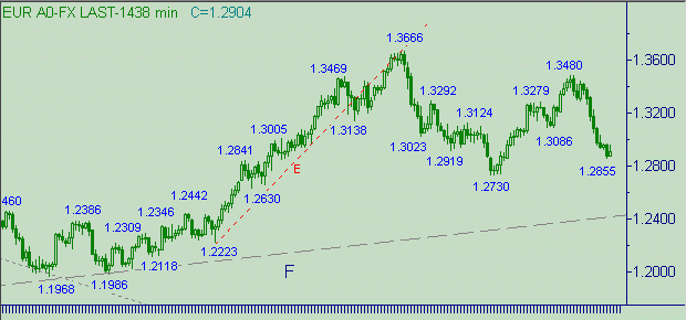 Евро/доллар призадумались. Совесть им должна подсказывать, что формирование down-трендов при отсутствии приличных коррекционных откатов не есть признак хорошего тона. Вчерашний минимум, равный 1.2855, ухудшил нашу ситуацию с открытыми позициями, но улучшил расклад на графиках, а точнее в нисходящем тренде на рис. 3 вдоль линии K расклад движения стал значительно симпатичнее. Структура движения стала более похожа на законченный пятиволновой нисходящий импульс. Вчера мы занимались поиском возможного окончания этого нисходящего движения (вдоль линии K на рис. 3). Признаемся честно, что область вблизи 1.2855 у нас не фигурировала в списке потенциальных областей окончания локального нисходящего движения. Два возможных объяснения этого феномена: первое - мы бываем не всегда правы; второе - нисходящее движение так и не закончилось.