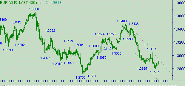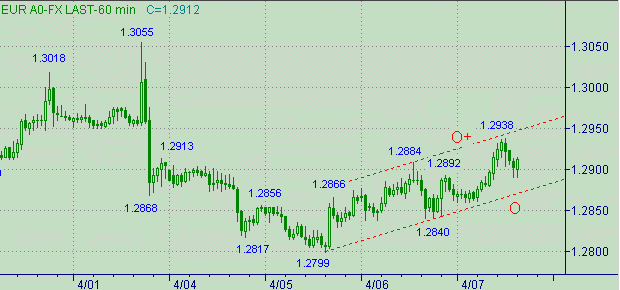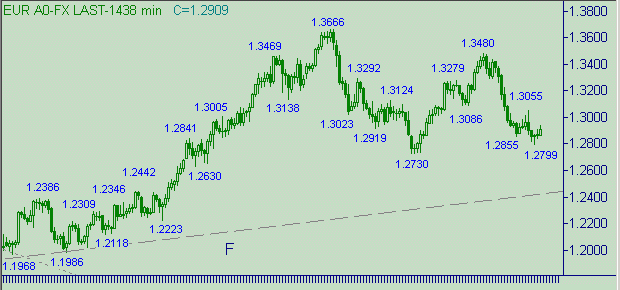 Под вопросом сохранность границ канала O-O+ на рис. 3. Структура движения в канале O-O+: первая восходящая ветка - 1.2799-1.2884 длина 85п.; вторая - 1.2840-1.2938 длина 98п. Сам максимум в этом канале заодно протестировал снизу и линию U на рис. 2. Отметим, что максимум в канале O-O+ немногим не дотянут до области 1.2960 - не хватило только 22п.
