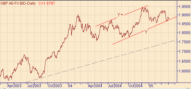 Сам нейтральный коридор обязан своей жизнью числу 38.2. Так верхняя граница этого коридора образуется в случае когла восходящее движение в канале O-O+ по велинчине будет составлять 38.2% от величины роста курса 12.8592(28/03/05)-1.8976(1/04/05). А нижняя граница -когда нисходящее движение 1.8858(7/04/05)-1.8845(7/04/05) по длине соответствует 38.2% от длины последнего down тренда 1.8976(1/04/05)-1.8707(4/04/05) - см. на рис. 2. Эта же область является техническим оплотом "Быков" - техническая поддержка.