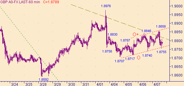 С одной стороны фунт/доллар находятся вблизи нижней границы нейтральной области 1.8755-1.8860, но с другой - пятиволновое изменение курса в самом канале O-O+ не вселяет up-оптимизм. Опять остаемся при том же мнении - ждем выхода из коридора. В случае выхода выше 1.8860, целевая область - 1.9080. В случае выхода ниже 1.8750 - целевая область 1.8600. В общем, ищем варианты на постановку позиций для двух возможных вариантов.
