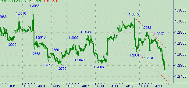 Теперь попытаемся сформулировать то, что мы имеем сейчас. А имеем мы нисходящий тренд, отменяемый выходом курса выше 1.2950, с целевой областью 1.2550. Для локального нисходящего движения с началом от 1.2953(13/04/05) важный уровень сопротивления рассматриваем на уровне 1.2860.