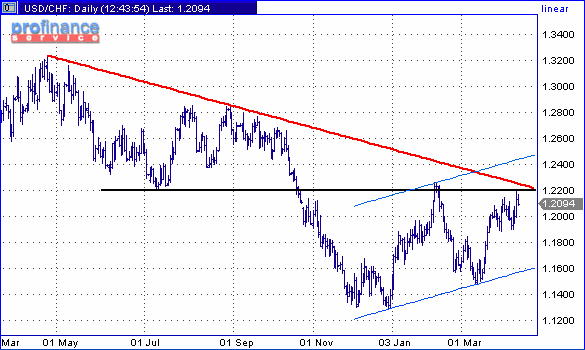 Судя по графикам, именно так и будет. По словам Стивена Миллера, технического аналитика Merrill Lynch, на пути доллара к недельному закрытию выше 1,2033 франка находится важное сопротивление.