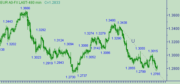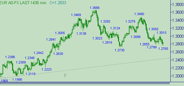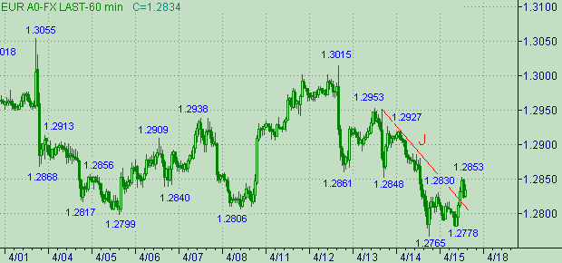 "Что сказать, ну что сказать .." - однозначно можно утверждать (точнее будет - с высокой вероятностью), что сейчас рынок определяется с коррекционным движением от снижения курса вдоль линии J. Для этой коррекционной формации (может быть уже и восходящего движения, хотя это не важно) приметным уровнем является область 1.2860 в силу структуры самого нисходящего движения с началом от 1.3015(12/04/05): первая ветка - 1.3015(12/04/05)-1.2861(12/04/05) длина 154п.; вторая - 1.2953(13/04/05)-1.2765(14/04/05) длина 188п. Так что пока курс остается ниже 1.2860 у участников рынка остается надежда на формирование третьей ветки, не заходя в зону коррекции от первой. И в рамках этой третьей ветки попытаться выйти ниже уровня 1.2768, который является значением цены, при которой длина нисходящей ветки с началом от 1.3480(11/03/05) составляет величину равную 76.4% от длины предыдущей нисходящей ветки 1.3666(30/12/04)-1.2730(7/02/05).