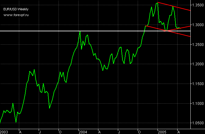 04:01 nemo-X: Меня всего рям распирает от долгого молчания, но за недостатком времени изложу вкратце свое мнение о происходящем безобразии...Евра сегодня сделала 1.2941...Эту же цифру она выдавала уже 7 апреля...Если посмотреть на 4-х часовку, то можно увидеть, что потенциально сейчас она пойдет рисовать двойное дно на 1.2764..Не бедет тренда...Не будет...Меня тут многие учили смотреть на большие графики...Ну, посмотрите на дневной график...Ну, по приборам евре вниз категорически...В понедельник народ вспомнит про ставки, шо могут на 0.5 поднять, а может даже и перерыва делать не будут и вприпрыжку вниз...Только во вторник...А в понедельник нам все звонче будут петь про ослабление доллара и давление на него бюджетного дефицита...А во вторник там чего нибудь из новостей выйдет и бойню быкам заделают...Ну вот так, примерно...На неделе поглядим как на самом деле будет...Поскольку я еще в рынке ( кстати, отчет завтра выложу в известном Вам месте к вечеру ...) то надо же какие то предположения строить на неделю...Попробую это раз в конце недели делать и смотреть, чего выйдет...