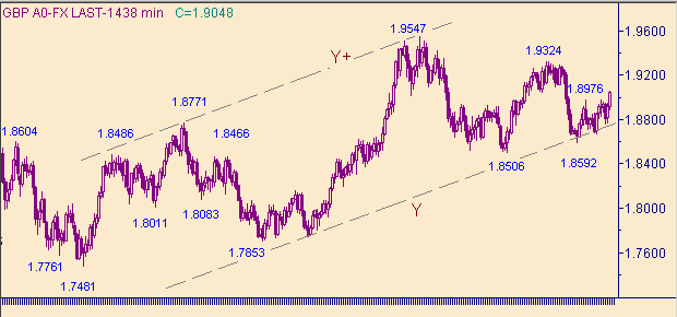 Фунт/доллар подходят близко-близко к своей целевой области - 1.9055-1.9065. В этой области имеем равенство длин восходящих движений. Первое up-движение с началом от 1.8592(28/03/05) представляет канал Y-Y+ на рис. 2, в котором первая восходящая ветка - 1.8592(28/03/05)-1.8976(1/04/05) длина 384п.; вторая началась от 1.8669(8/04/05). Равенство длин веток имеем на уровне 1.9054. В свою очередь вторая ветка так же состоит из двух up-составляющих: первое восходящее поддвижение: 1.8669(8/04/05)-1.8974(12/04/05) длина 3305п.; второе началось от 1.8757(14/04/05). Равенство длин поддвижений имеем на уровне 1.9062. Примерно та же целевая область получается из рассмотрения структуры самого восходящего движения с началом от 1.8757(14/04/05) (канал E-E+ на рис. 3) - не будем утомлять выкладками и расчетами.