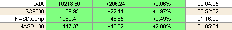 Американские акции на торгах в четверг продемонстрировали рекордную позитивную динамику и закрылись на мажорной ноте. Среди компонентов индекса Dow лишь три компании из 30 остались в отрицательной зоне, а сам индекс реализовал максимальный за 2 года суточный рост. Индекс ФРБ Филадельфии оказал поддержку пессимистично настроенным участникам рынка, развеяв опасения относительно глобального замедления экономического роста в США. Игроки смогли полноценно оценить пакет сильных корпоративных отчетов, опубликованных в среду, а квартальные результаты Motorola внесли дополнительную позитивную ноту в проходящий сезон квартальных результатов. Компания United Parcel Service Inc. также помогла повысить доверие к Wall Street, опубликовав свой квартальный отчет, в котором прибыль превзошла намеченные ранее цели. Акции United Parcel Service выросли на 5% до 70.56. Однако не все в настоящий момент позитивно настроены в отношении перспектив фондового рынка США. Так Тим Хикин, глава торговли акциями из инвестиционного банка Thomas Weisel Partners считает, что рынок продолжит погружение, поэтому произошедшее ралли целесообразно использовать для продаж.