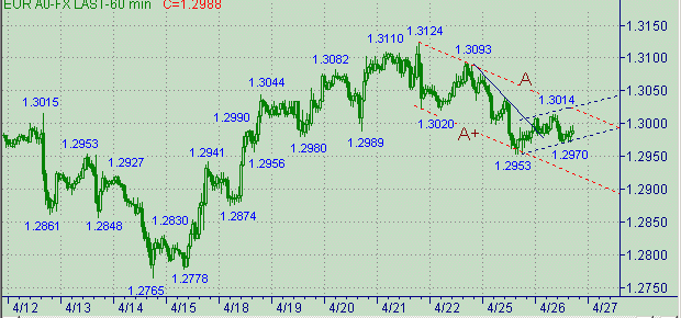 Коррекционный канал A-A+ на рис. 3 сохранился. Текущее положение линии A на рис. 3 соответствует значению курса 1.3021. Для нисходящего движения с канале A-A+ важным уровнем рассматриваем уровень, равный 1.3040. Выход курса выше этого значения цены не отменяет самого нисходящего или коррекционного движения, а обозначит нам окончание первой нисходящей ветки. Итак, важные уровни сопротивления: 1.3040, 1.3090.