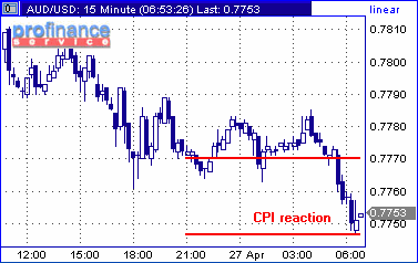 Австралийский доллар в течение всей сегодняшней азиатской сессии находился под давлением против американской валюты в ожидании внутреннего ключевого показателя недели - индекса потребительских цен за 1 квартал текущего года. Согласно опубликованным правительственным данным, инфляционное давление в стране в указанный период выросло лишь на 0.7%, что ниже прогнозов экономистов, которые рассчитывали увидеть рост инфляции на 0.8 процента. Подобные темпы позволяют рассчитывать на сохранение годового показателя инфляции в заданном Резервным Банком Австралии диапазоне, что сводит на "нет" вероятность повышения процентной ставки на следующем заседании. Разочарованные спекулянты активировали продажи австралийской валюты, что вызвало падение курса пары AUD/USD ниже 0.7765 и привело к поглощению нижестоящих стопов. В данный момент курс находится в районе поддержки на 0.7750.