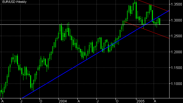 Период консолидации над сильной поддержкой, образованной вершинами 2004 г, завершен. Рынок совершил классический "обратный ход" к пробитой древней линии аптренда и продолжил движение вниз. И хотя линия горизонтальной поддержки, определенная по линейному графику, и проходящая через отметку $ 1.2840 может предоставить временную поддержку, медвежье поглощение, сформировавшееся на недельном графике, позволяет предположить, что свеча следующей недели будет черной. Прежние цели снова становятся актуальными: $ 1.2730 - минимум 2005 г, а также нижняя граница полотнища бычьего флага на недельном линейном графике, $ 1.2570 - вершина на месячном графике, $ 1.25 - нижняя граница полотнища бычьего флага на недельном свечном графике, $ 1.2460 - верхняя граница летнего рейнджа. Рекомендация: продавать от $ 1.29/1.2950 со стопом на $ 1.3010 и указанными выше целями.
