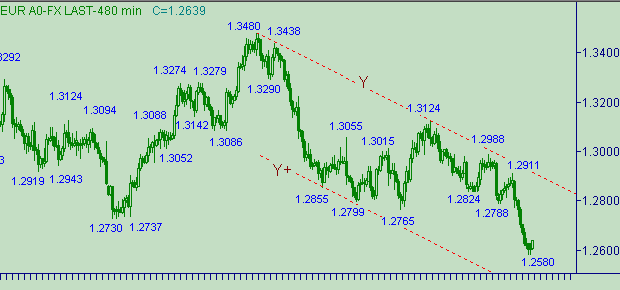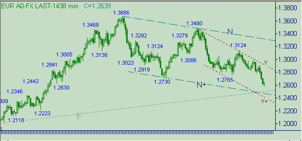 Сегодня закончился трехдневный нисходящий канал E-E+ (см. на рис, 3). В итоге имеем канал величиной в 321п. - 1.2911-1.2580. В связи с выходом курса в область ниже 1.2600 вспомним, что интересного находится рядом с сегодняшним минимумом, равным 1.2580. На рис. 1 рассматриваем канал N-N+: равенство длин нисходящих веток в этом канале (первая ветка - 1.3666(30/12/04)-1.2730(7/02/05); вторая началась от 1.3480(11/03/05)) находится на уровне 1.2544. Рассматриваем вторую ветку в канале N-N+ составляющую канал Y-Y+ на рис. 2, в которой на уровне 1.2578 длина второго нисходящего поддвижения (с началом от 1.3124(21/04/05)) составляет 76.4% от длины первого поддвижения (1.3480(11/03/05)-1.2765(14/04/05)). Напомним, что равенство длин нисходящих поддвижений в канале Y-Y+ находится на уровне 1.2409.