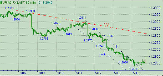 В связи с обозначавшейся коррекцией возникает много вопросов. Точнее вопрос то один, но вариантов ответов на него несколько. Вопрос такой: от какого нисходящего движения формируется коррекционная формация? Или по другому, какое нисходящее движение закончилось? Варианты ответов: закончилось нисходящее движение с началом от: 1.2911(11/05/05), 1.2988(5/05/05), 1.3124(21/04/05), 1.3480(11/03/05). От ответа на этот вопрос зависят наши ожидания на глубину коррекции. На текущий момент коррекционные целевые уровни рассматриваем в близи областей: 1.2730, 1.2785, 1.2915. Если рассматривать коррекцию от снижения курса в канале E-E+ на рис. 3, то добавляем ещё два целевых уровня: 1.2665 и 1.2690. Из всех этих уровней технически наиболее важным является уровень 1.2915, хотя бы по тому, что он выше остальных уровней расположен. Другая причина выделять 1.2915 - техническим сигналом на смену настроения участников рынка (понимайте - на смену тренда) будем считать закрытие дня выше 1.2915. Эта цифра соответствует сегодняшнему положению дел. По ходу дела этот критериальный уровень может изменяться, конечно под нашим бдительным наблюдением.