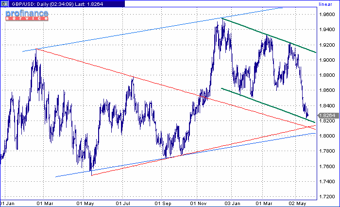Теперь обратимся к графику дневного временного интервала валютной пары фунт/доллар. Как мы видим восходящий канала 2004 года (синие линии) имеет более пологий наклон, чем в паре евро/доллар. Отчасти этим обосновывается наблюдаемая в последнее время повышенная волатильность курса данной пары. При этом мы видим, что по сравнению с евро, британский стерлинг имеет еще вполне существенный запас для снижения в рамках восходящей тенденции прошлого года, поскольку текущее значение нижней синей линии отмечено в области 1.8050. При этом курс пары максимально приблизился к намеченной нами цели на 1.8200, находясь в настоящий момент в непосредственной близости от нижней границы нисходящего краткосрочного канала (зеленая линия). Область 1.8200 является ближайшей ключевой поддержкой для британской валюты. В случае ее пробития открывается следующая цель, которую мы располагаем на текущем значении нижней линии сходящегося треугольника, покинутого в конце прошлого года (красные линии). Далее основная цель на нижней границе восходящего канала 2004 года. В случае устойчивости ближайшего уровня поддержки мы ожидаем возвращение к нормали краткосрочного нисходящего канала в область отметки 1.8600.
