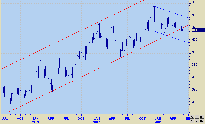 По установившейся традиции пришло время перейти к технической картине валютного рынка. Сегодня мы ее рассмотрим в развернутом варианте. В первую очередь обратив внимание на график дневного временного периода пары евро/доллар. К технической картине, построенной с точки зрения классического технического анализа (восходящий канал 2004 года синего цвета и установленный в этом году нисходящий канал зеленого цвета), мы добавляем на этот раз постоянно используемые нами Вилы Эндрюса, построенные в начале 2004 года, поскольку они до сих пор не потеряли свою актуальность (линии красного цвета). Данный вид построений трендовых линий, согласно методике, полностью исключает человеческий фактор в рамках желания провести ту или иную линию в варианте "подстройки" под ценовые экстремумы. Сконцентрируем свое внимание на наблюдавшемся в недавнем времени пробитии верхней линии Вил Эндрюса сверху вниз, после чего курс пары предпринял попытку проверить ее на прочность уже в качестве сопротивления. Однако цены не дошли до этой линии снизу вверх и в последствии протестировали нижнюю синюю линию восходящего канала 2004 года. Сейчас мы находимся в стадии консолидации между верхней красной линией Вил Эндрюса и нижней линии восходящего канала 2004 года.
