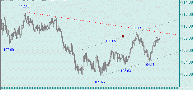 Идеи понятны. В случае выхода выше 108.30 пытаемся разглядеть возможности постановки позиции на покупку, а в случае выхода курса ниже 107.20 - на продажу. На текущий момент - вне рынка.