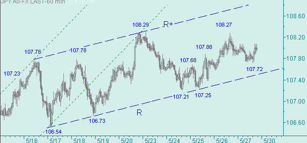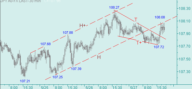 Ситуация не изменилась. Рынок не смог выйти ниже 107.75, но и не вышел выше 108.27. Текущую ситуацию определяем как процесс формирования коррекционной формации от роста курса в канале H-H+ на рис. 4. Имеем два критерия. Первый закрытие часа ниже 107.75 обозначит нам попытку формирования нового нисходящего движения. А выход выше 108.30 - продолжения формирования третьей восходящей ветки в канале R-R+ на рис. 3. Где первая ветка - 106.54(17/05/05)-107.78(18/05/05); вторая - 106.73(18/05/05)-108.29(23/05/05). Предполагаем, что третья ветка началась от 107.21(24/05/05). Для любителей классики, т.е. классического технического анализа, в случае выхода курса выше 108.30 начинает свою работу фигура продолжения "Клин". Сам клин обозначен на рис. 4 линиями T-T+. Кандидатами на звание "древка" в "Клине" являются два восходящих движения: первое - само восходящее движение в рамках канала H-H+, т.е. рост курса 107.21-108.27; второе - рост курса в третьем восхождении в канале H-H+ на рис. 4, т.е. 107.39-108.27. Сценарии продолжения на рост курса доллара имеют технические проблемы в интервале цен 108.60-109.00. Об этом мы уже писали и не раз.