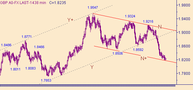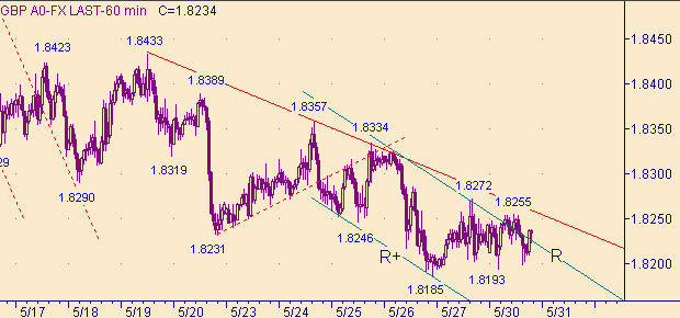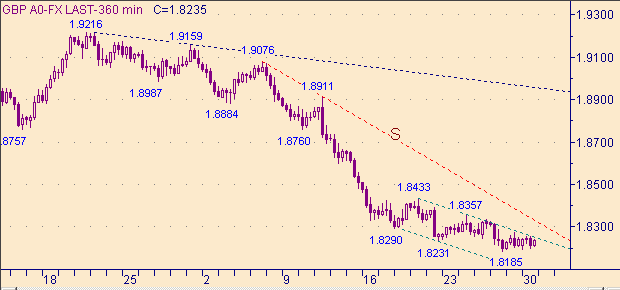 От пятничного максимума, равного 1.8272, ожидали формирования третьей нисходящей ветки в канале R-R+ на рис. 3. Однако на текущий момент этот процесс не получил развития. Утешением является только тот факт, что пока курса фунт/доллар не смогут выйти выше уровня 1.8384 (уровень начала второй ветки в канале) ожидания третьей ветки остаются актуальными. Не смотря на то, что линия R на рис. 3 пробита, границы канала могут рынком корректироваться. Справедливости ради отметим, что на рис. 1 видно, что рынок третий день топчется около линии N+ на рис. 1. Вблизи уровня 1.8185 сошлись интересы двух каналов - канала N-N+ на рис. 1 и канала R-R+ на рис. 3. Кто то должен уступить. Пока уступает "младший" (по времени формирования) канал.