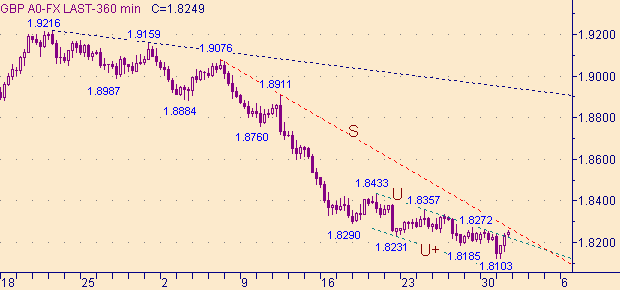 Нисходящее движение с началом от 1.9076(5/05/05) (линия тренда соответствует линии S на рис. 2) выглядит как никогда законченным. Однако это все предположения. На повестке дня вопрос о законченности или незаконченности нисходящего движения с началом от 1.8433(19/05/05) (канал U-U+ на рис.2). Сейчас фунт/доллар пытаются пробиться выше линии U.