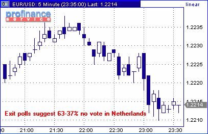 По данным голландского телевидения, проводившего опрос голосовавших на референдуме, граждане Нидерландов кардинальным образом отклонили конституцию ЕС. Предварительный общенациональный exit poll показал, что 63% голосовавших проголосовало против ратификации и лишь 37% сказали на референдуме "да". Если после официального подсчета голосов эти данные будут подтверждены, то результат голосования будет намного хуже предварительных ожиданий. Единая европейская валюта отреагировала ослаблением против американского доллара, протестировав новые минимумы на 1.2210. В данный момент серия бидов расположена на 1.2200, которые пока оказывают поддержку евро. Ниже расположены защитные стоп приказы.