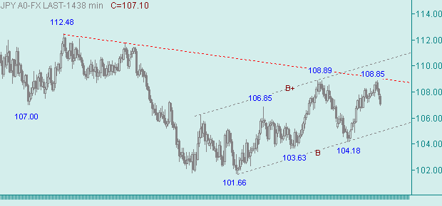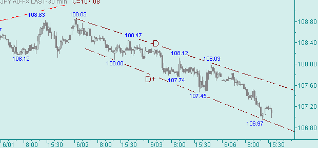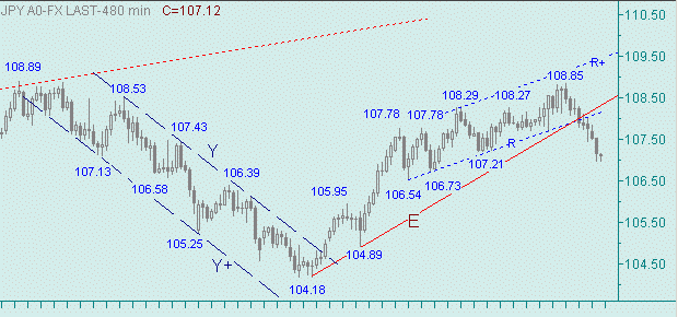 Имеем попытку отбития курса от важной технической области - интервала 108.60-109.00. Поводом для этого послужило формирование коррекции от роста курса вдоль линии E на рис. 2 (up-движение с началом от 104.18(4/05/05)). Сама коррекционная формация в графическом виде имеем вид расходящегося клина - на рис. 3 и обозначена линиями D и D+. На сегодня важной технической областью считаем уровень 106.54, т.к. выход курса ниже этого значения цены подтвердит нам, что коррекция формируется действительно от движения вдоль линии E. Выше уровня 106.54, как вариант, коррекция может формироваться от роста курса в канале R-R+ на рис. 2 и 3.