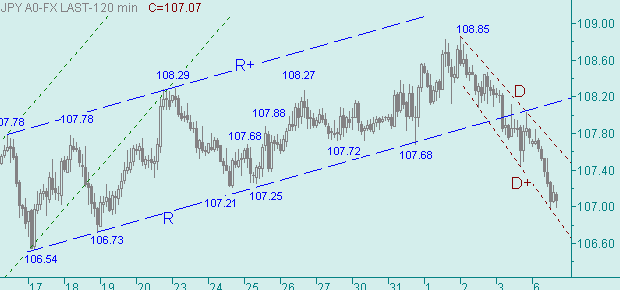 Для нисходящего движения между линиями D и D+ важный технический уровень сопротивления рассматриваем вблизи области 107.60. Важная поддержка понятна - уровень 106.54.