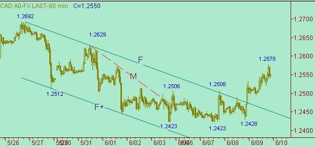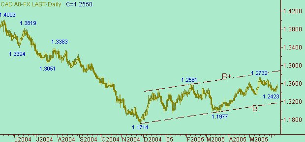 В рамках up-порыва рынок тестирует важный технический уровень 1.2580. Если американцу/канадцу удастся остаться ниже этого значения цены, то нисходящее движение с началом от 1.2692(26/05/05) имеет перспективу продолжаться как полноценный down-тренд в рамках канала H-H+ на рис. 2. В случае выхода выше 1.2580 все нисходящее движение с началом от 1.2732(16/05/05) скорее всего будет или законченной коррекционной формацией или частью более крупной коррекции.