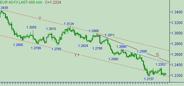 Других мыслей нет, кроме как открывать позицию на покупку от уроня 1.2215 (если курс опустится до этого уровня). Есть много минусов у этой позиции, а именно открытие позиции при вторичном подходе к этому уроню, а так же - стоп-лосс приходится определять немногим выше 1.2150, что есть не удобно и не хорошо. Цель для позиции на покупку - 1.2400. Промежуточные цели для переноса стоп-лосса - 1.2250, 1.2290, 1.2360. Стоп-лосс - 1.2171.