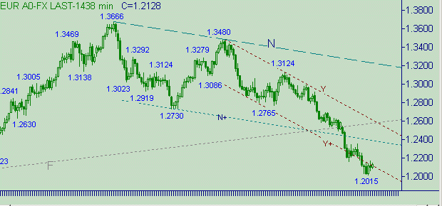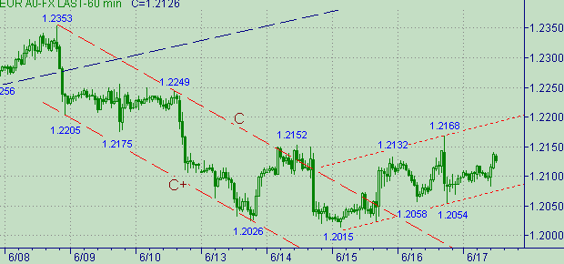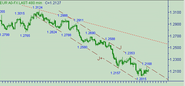 Первая попытка закрепиться выше уровня 1.2155 закончилась откатом на 100п. вниз по графику. В общем и целом считаем, что ситуация не изменилась. Нисходящий канал J-J+ на рис. 2 остается в добром здравии. Текущее положение линии J на рис. 2 соответствует значению курса 1.2169. А текущую ситуацию можем определить как формирование коррекции от снижения курса в канале C-C+ на рис. 3. Утверждать о формирование коррекционной формации от канала J-J+ пока очень и очень рано. Для этого необходимо выполнение одного из двух условий: или коррекция затянется во времени или курс выйдет выше уровня начала своего движения в канале C-C+, т.е. выше уровня 1.2351.