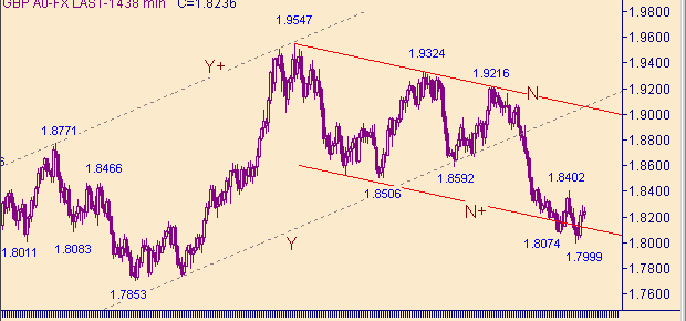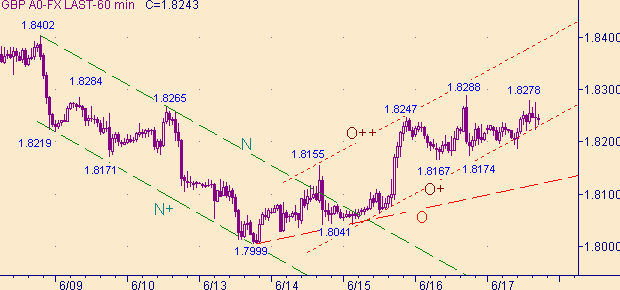 Текущую ситуацию определяем как формирование коррекционной формации от роста курса во второй ветки (1.8041(15/06/05)-1.8288(16/06/05)) канала O-O+ на рис. 3. По сравнению со вчерашним днем наша оценка ситуации осталась прежняя. Рабочая модель - продолжение формирования коррекционной формации от снижения курса вдоль линии S на рис. 2. Канал O+-O++ на рис. 3 является составной частью этой модели. Целевую область для этого канала на сегодня опускаем до уровня 1.8350.
