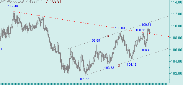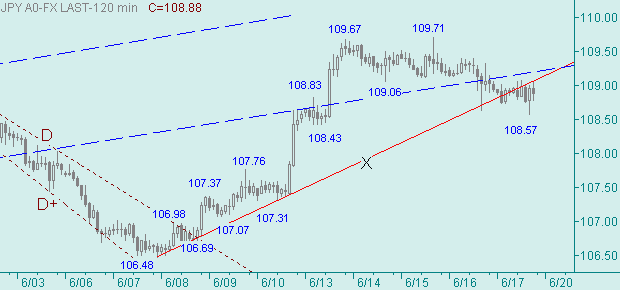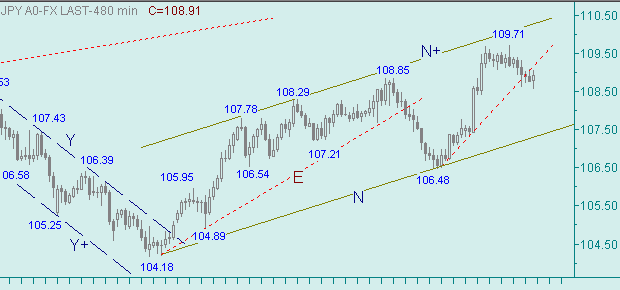 Всё идет к тому, что доллар/йена не смогут закрыть неделю выше уровня 109.00. Поэтому радость "Быков" было преждевременной и для закрепления курса выше 109.00 придется ещё побороться. Но основные "Бычьи" каналы остаются в процессе развития. На рис. 1 имеем восходящий канал B-B+ с обозначившейся третьей восходящей веткой с началом от 104.18(4/06/05). Эта самая третья ветка на рис. 2 обозначена каналом N-N+. Сейчас рынок озабочен проблемой второй восходящей ветки в канале N-N+, которая представлена на рис. 3 восходящим движением вдоль линии X. Проблема заключается в ответе на вопрос - от какого движения формируется коррекция с началом от 109.71(15/06/05) - см. на рис. 3. Первый и самый простой вариант ответа - от роста курса вдоль линии X. Т.е. в этом ответе предполагается, что само восходящее движения вдоль линии X закончилось. Тогда актуальным становится вопрос о законченности или незаконченности самого восходящего движения с началом от 106.48(7/06/05). Возможен сценарий когда движение вдоль линии X на рис. 3 является только первым восходящим движением во второй up-ветки канала N-N+.