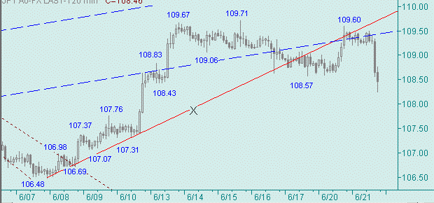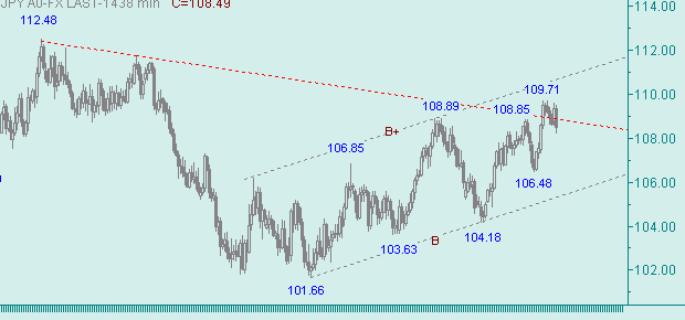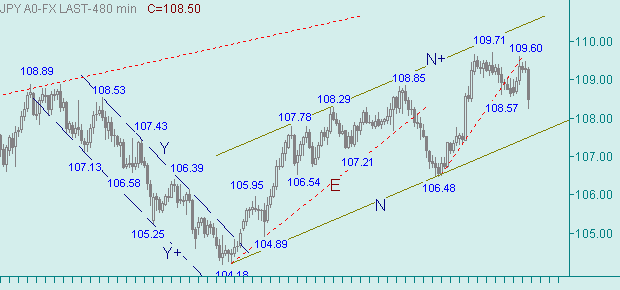 Доллар/йена очень технично протестировали свою бывшую линию поддержки, только уже снизу, и сейчас своим интенсивным движением вниз как бы обозначает окончание второй восходящей ветки в канале N-N+ на рис. 2. Но нас не так то просто "обвести вокруг пальца", что бы мы так запросто и поверили в это окончание второй ветки. Для этого необходимо как минимум протестировать линию N. Вот тогда мы и поверим. Ближайшая техническая цель для нисходящего движения - уровень 107.70. Текущее положение линии N на рис. 2 соответствует значению цены 107.48.