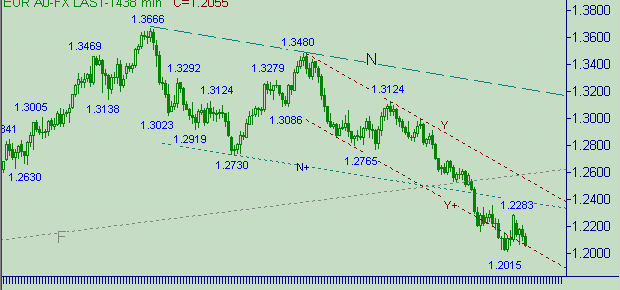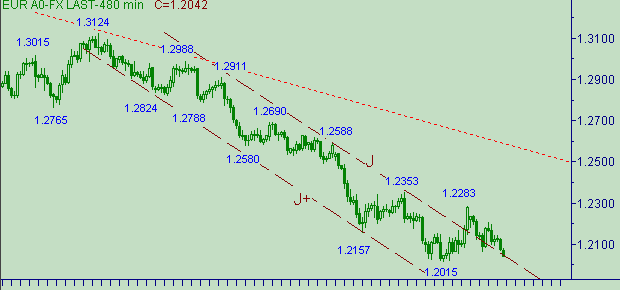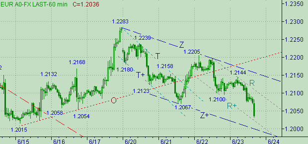 В нисходящих движениях в рамках каналов Z-Z+ и R-R+ (см. на рис. 3) евро/доллар споткнулись на первом целевом уровне из вчерашнего списочного состава - уровень 1.2075. Сейчас евро/доллар бодренько так двигаются далее вниз по графику. Курс вышел ниже уровня 1.2054, который важен для восходящего движения с началом от 1.2015(15/06/05) как уровень начала второй восходящей ветки в этом движении. После выхода курса ниже 1.2054 будем считать рост курса, обозначенного линией O на рис. 3. завершенным. Но сама текущая рабочая модель изменения курса (формирование коррекционной формации от снижения курса вдоль линии S на рис. 2) остается в силе. Модель перестает быть рабочей и актуальной в случае выхода курса ниже 1.1980. Целевые уровни для нисходящего канала Z-Z+ на рис. 3: 1.1985, 1.1855. Подобные же уровни, но уже для канала R-R+ на рис. 3: 1.2040, 1.1990, 1.1925, 1.1855. Как видим вблизи ценового интервала 1.1985-1.1990 и уровня 1.1855 имеем совпадение технических интересов двух нисходящих каналов. Именно поэтому уровень 1.1980 нами выбран как критериальный - выход курса ниже него есть подтверждение down-движения.
