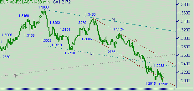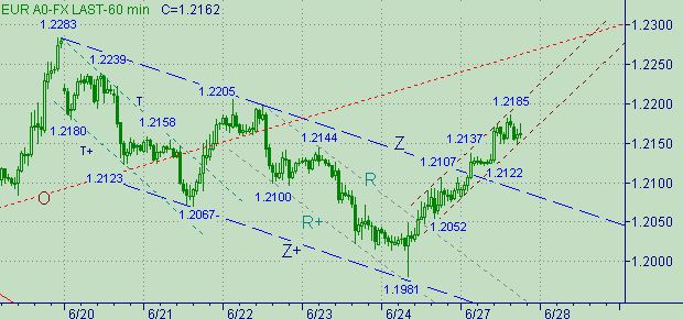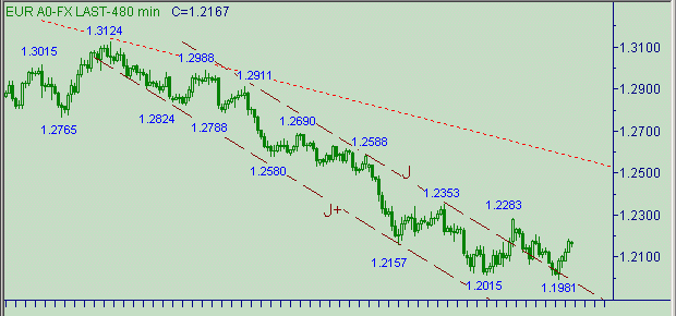 Симпатичная модель формирования коррекционной формации о снижения курса в нисходящем канале J-J+(см. на рис. 2) продолжает жить и работать. Сейчас формируется вторая восходящая ветка с началом от 1.1981(24/06/05) в этой модели изменения курса. Ближайший целевой уровень для этой восходящей ветки ожидаем на уровень 1.2205. Далее целевые уровни расположились в следующем порядке: 1.2245, 1.2275, 1.2335, 1.2355.