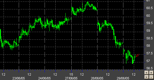 Как сообщило Управление энергетической информации министерства энергетики США, запасы нефти за неделю, завершившуюся 24 июня, выросли на 1.1 млн. баррелей (м/б) до 328.5 м/б, запасы бензина - на 300.000 баррелей до 216.2 м/б, запасы дистиллятов - на 1.7 м/б до 113.2 м/б, а запасы печного топлива - на 1.6 м/б до 43.8 м/б. По данным Американского института нефти (API), запасы нефти в США на прошлой неделе выросли на 2.9 м/б до 325.819 м/б, запасы бензина - на 464.000 баррелей до 216.196 м/б. Объем запасов дистиллятов вырос на 2.0 м/б до 113.159 м/б баррелей, печного топлива - на 450.000 баррелей до 42.140 м/б. Аналитики, опрошенные агентвом Reuter, прогнозировали сокращение запасов нефти на 1.4 м/б, рост запасов дистиллятов на 1.5 м/б и запасы бензина на стабильном уровне. Хотя данные EIA и API по итогам недели редко совпадают, оба отчета, как считается, отражают в целом общий уровень запасов. В EIA, аналитическое подразделение министерства энергетики, поступает больше данных о запасах нефти, поскольку по закону компании обязаны сообщать их правительству. API полагается на добровольное участие своих членов в подсчетах. Цены на нефть снизились после выхода данных, что видно на графиках, однако появившиеся в последний час слухи о смерти короля Саудовской Аравии, если найдут подтверждение, вернут цены выше уровня $ 60 за баррель. Технически, они также должны вернуться туда, поскольку сырье формирует уже традиционный для себя расходящийся треугольник.