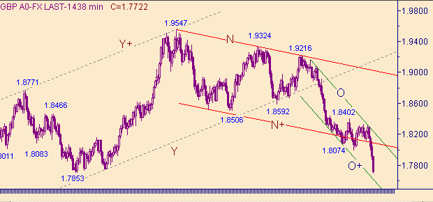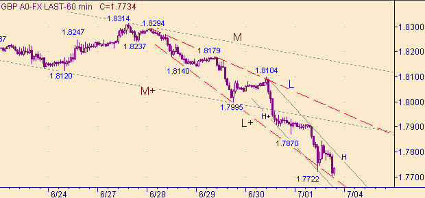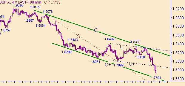 Количество нисходящих движений-поддвижений-трендов-подтрендов стало такое, что впору тут запутаться. Добавили на рис. 2 и 3 канал O-O+. Из того, что мы смогли выжать рассматривая нисходящие движения приводим следующее - ближайший технический целевой интервал 1.7680-1.7700. И два уровня расположились немного ниже: 1.7640 и 1.7500. Из всего этого небогатого хозяйства выделяем уровень 1.7640 как более важный, т.к. вблизи него имеем цели от нескольких нисходящих движений.