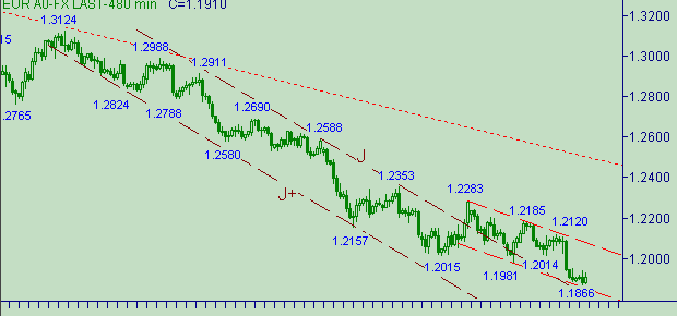Евро/доллар находятся в процессе поиска локального дна. Вчера мы писали про набор целевых уровней, расположенных ниже 1.1900. С этой же проблемой и встретились две рассматриваемые пары валют. Коррекция вроде бы и необходима, но от какого уровня начать её это ещё вопрос. Истоки этой проблемы мы так же вчера обозначили - увеличение числа нисходящих вложенных друг в друга движений, каждый из которых имеет свои технические целевые уровни. Тут кто хочешь запутается - попробуй с большой вероятностью определить какое down-движение уже закончилось, а какое ещё продолжается. Проблема..