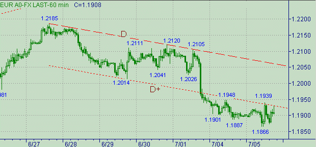 Помочь нам может только выход курса выше 1.1950. Тогда мы поймем, что действительно формируется коррекция не очень четко понимая от какого именно снижения на графиках она формируется. Естественно первый вариант - коррекция формируется от последнего нисходящего движения 1.2105(1/07/05)-1.1866(5/07/05).