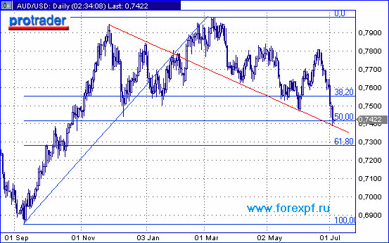 Курс австралийского доллара против американской валюты продолжает консолидироваться в близи уровня 0.7400, после стремительного падения на европейской сессии во вторник. Стоит отметить, что аусси терял свои позиции также и против единой валюты, йены и новозеландского доллара. Сообщение о том, что ставки в Европе скорее будут повышены, нежели понижены (со ссылкой на источник в ЕЦБ), активировало перепозиционирование рынка и выход из существенного накопившегося за последнее время объема длинных позиций. Реакция вполне обоснована, поскольку австралийский доллар относится к разряду высокодоходных валют, поэтому новости о том, что расширения дифференциала ставок между Европой и Австралией может не наблюдаться, провоцируют выход из австралийских активов, в том числе и из правительственных облигаций.