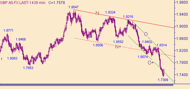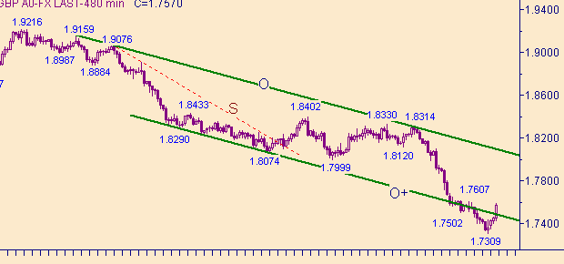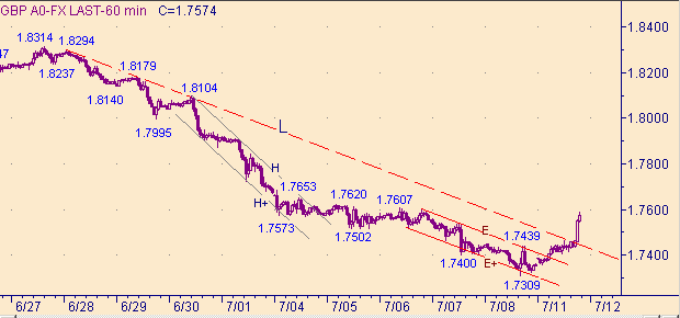 Рынок пытается обозначить окончание второй нисходящей ветки в down-движении обозначенным на рис. 2 каналом O-O+. Сегодня рынок чисто-конкретно пытается выйти выше линии L на рис. 3 - закрыть час выше 1.7460. Коррекционное движение от скромненького канала E-E+ на рис. 3 переходит в более масштабную коррекцию. Понятно, что важным уровнем при рассмотрении перспектив коррекции является уровень 1.7607.
