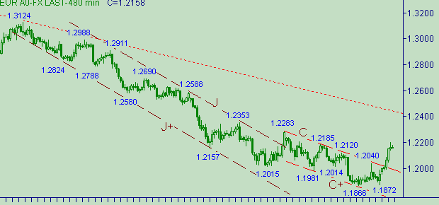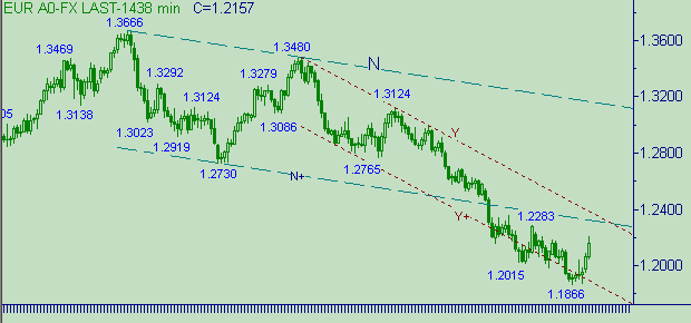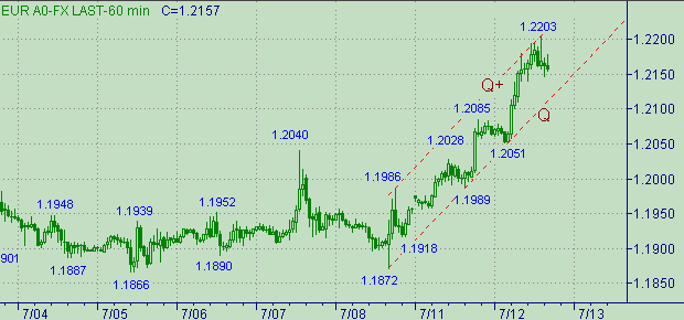 Вот и разрешилась проблема живучести или не живучести канала C-C+ на рис. 3. Сегодня курс вышел таки выше 1.2183 и тем самым надежда на формирование третьей нисходящей ветки в этом канале растаяла в дневном свете. Сегодняшний максимум равен 1.2203 и соответствует попаданию в целевой интервал 1.2200-1.2215. Наблюдаем процесс фиксации прибыли и размышлений над перспективами дальнейшего up-движения - формирование коррекционной формации. В случае формирования коррекции от роста курса в канале Q-Q+ на рис. 3 ожидаем в качестве целевой области интервал 1.2080-1.2110.