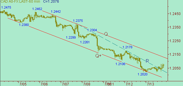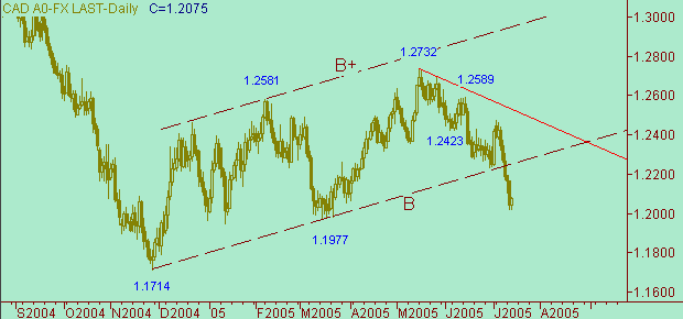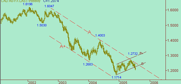 Заминку с нисходящим движением в канале Q-Q+ на рис. 4 связываем с психологическими проблемами, возникающими при приближении к уровню 1.1977, который является началом второй восходящей ветки в канале B-B+ на рис. 2. Понятно нам так же как и Вам, что пока курс находится выше 1.1977 у рынка остается шанс для формирования третьей up-ветка в канале B-B+ на рис. 2. Поэтому потенциал возможной третьей нисходящей ветки уже в канале A-A+ на рис. 1 (ветки с началом от 1.2732(21/05/05)) остается под большим сомнением. Вот такие глобальные проблемы, связанные с возможностью продолжения одних направленных движений в ущерб других противоположно-направлненных движений, решаются вблизи уровня 1.1977.