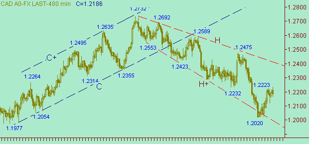 Остаемся в пределах модели формирвоания коррекционной формациии от снижения курс в нисхоядщем канале Q-Q+ на рис. 1. Сегодня рынок пытался выйти выше уровня 1.2232, который является окончанием третьей нисходящей ветки в расширяющимся клине H-H+ на рис. 2. Сегодняшний максимум равен 1.2234. В случае выхода курса выше 1.2235 ближайшая целевая область находится вблизи 1.2300, а далее - 1.2375.