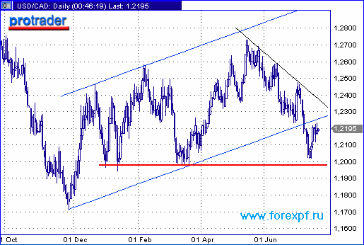 На торгах во вторник канадский доллар незначительно ослабился против своего американского коллеги. Азиатская и европейская сессии прошедшего дня прошли на фоне спроса на доллар США, чему способствовали комментарии главы Fed Сант-Льюиса Уильяма Пула в отношении того, что шаги в плане дальнейшего увеличения процентной ставки разумны, а также письмо Алана Гринспена, в котором глава ФРС США упомянул о том, что рост цен на нефть оказывает лишь незначительное давление на национальную экономику. Курс доллар/канада достиг во второй половине европейских торгов максимумов на 1.2230, однако, с момента завершения ликвидных торгов в Европе американская валюта утратила свою движущую силу. Канадская валюта также получает поддержку со стороны ожиданий возобновления увеличения процентной ставки BOC. Аналитики высказывают весьма оптимистичные предположения, говоря о том, что до конца года ставки будут повышены два раза, если не три. Поэтому выше уровня 1.2200 игроки начинают наращивать длинные позиции по канадскому доллару, что также весьма эффективно с точки зрения технической картины в данной паре. Последняя в большей степени не изменилась с момента публикации вчерашнего обзора. По-прежнему ключевую поддержку представляет собой область 1.2200/1.2175. С верхней стороны ориентиром для продаж выступает ранее пробитая нижняя линия среднесрочного умеренного восходящего канала. ProFinance.Ru - Forex News / Новости Форекс